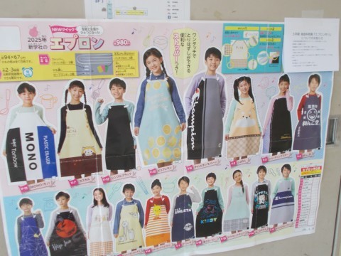 5年生は,3学期に家庭科の実習でエプロンを作ります。種類がありますので購入時には,番号をお忘れなく。保護者の皆さまも,ご確認ください。
