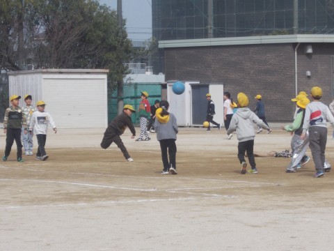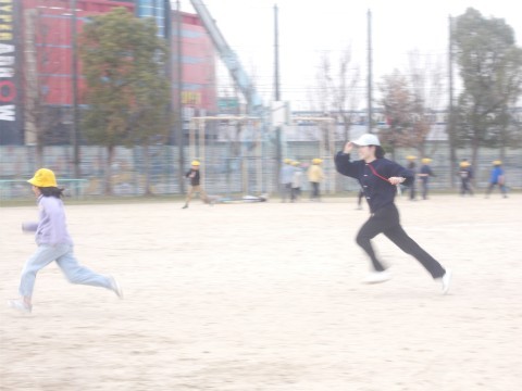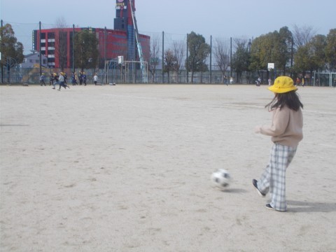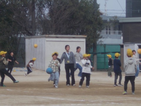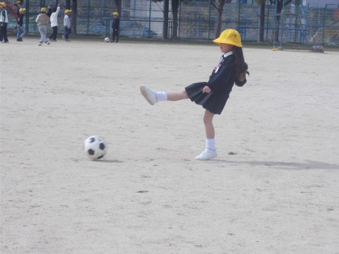 先生が本気で走ると,迫力がありすぎてびっくりします。1年生は,体育の時間のサッカーゲームの蹴る練習をしていました。