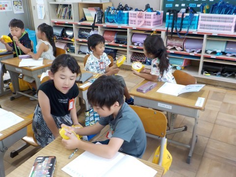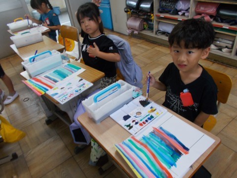 絵具の使い方を習いました。パレットに絵具を出す位置や,水でうすめる場所を教えてもらいました。体育では,国語科の「くじらぐも」の「みんなで空の雲に乗る」場面を実際にしてみました。かわいいかけ声が聞こえてきました。