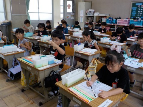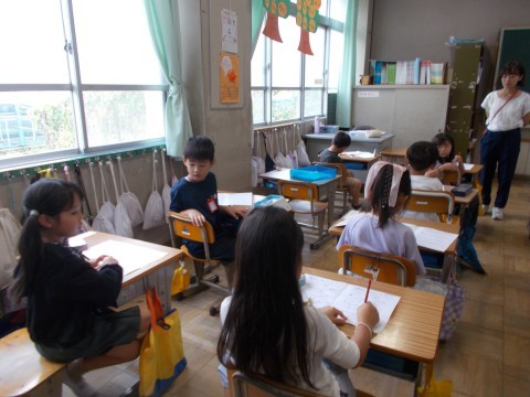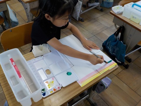 国語では「くじらぐも」のお話を自分読みしていました。ゆっくり文章を目で追いながら,イメージを広げていきます。算数はプリントの答え合わせをしていきました。図工では,絵具の出し方や水をつけることなどを習っていました。