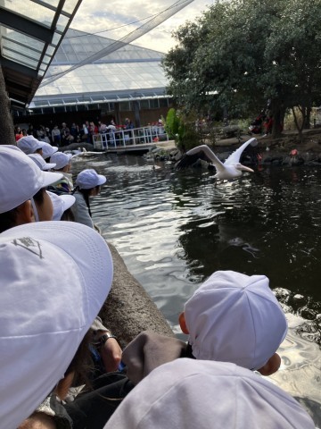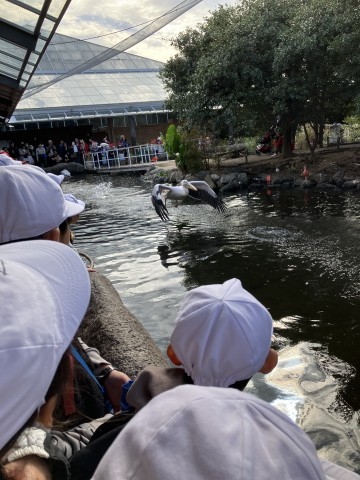 ペリカンフライトです。ペリカンが水面すれすれを飛びます。羽を広げると2メートルくらいになる姿は、迫力があります!