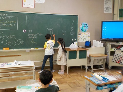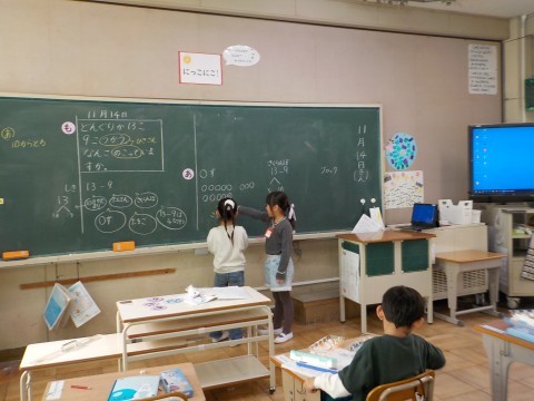 道徳では「ふわふわことば」「ちくちくことば」を考えてみました。自分たちが「うれしいな」と感じた言葉,「悲しいな」と感じたことばを書きました。また「とりかえっこ」というお話から,「小学校で楽しいこと」「幼稚園で楽しかったこと」を振り返っていました。算数では,具体物を使って引き算の問題を解いていきました。