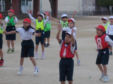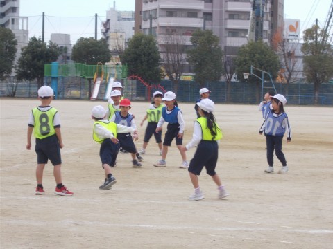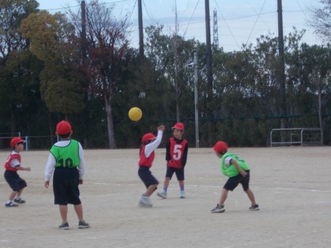 中あてをしていました。先生の笛の合図で,中の人・外の人が交代します。両手で投げる人もいますが,片手で投げる方が距離が伸びます。休み時間も練習しましょう!