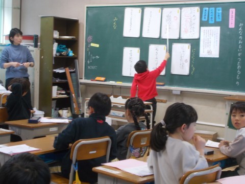 「たぬきの糸車」の最後の場面で,おかみさんとたぬきの会話を考え,このたぬきはどんなたぬきなのか,理由を付けて発表しました。「やさしいたぬき」や「はずかしがりやなたぬき」などの言葉を使って,表現しました。しっかり読み取れていました。