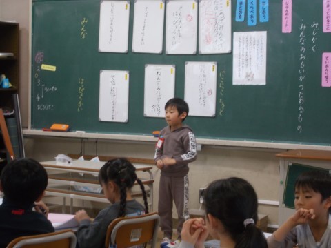 国語では,昔話を読んで「好きなところ」「おもしろかったところ」などを紹介する文章を書いています。どんな本がおもしろかったのかな。また,班で発表会をします。司会進行の台本や,発表する内容を決めていました。