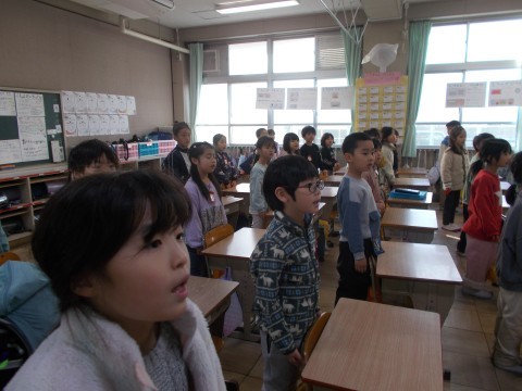 3学期の朝会は,校歌の3番を歌います。覚えているかな?