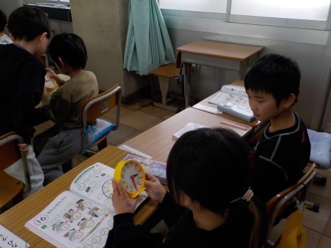 「おおきなかず」のプリントで復習したり,時計の「5分,10分,15分」の見方を習いました。これからは,時計を見て行動することができます。
