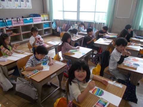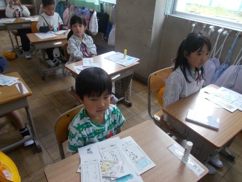 自分の机に貼られてあるシールを見ながら,名前を書きました。また,そのまわりに絵を描いたり,色を塗ったりしていました。書写では,姿勢や鉛筆の持ち方を練習しました。