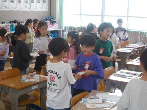 図工では「アイス」を描いています。好きな色を選んで,何段にも重ねていきます。おいしそうなアイスです!生活科では,名刺交換をしていました。自分の名前を丁寧に書いたカードを,友だちに渡しました。友だちの名前も覚えていきます。