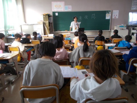 算数では「7の段」の意味を考えています。自分の考えをノートに書いて,友だちの意見も書いていきます。ノートを見返したときに,気づくこともあります。外国語では,ネイティブの先生が「インドネシア」の昔話をしてくれました。(英語で!)鬼が何度も出てきて面白かったです!