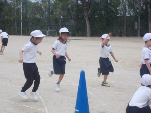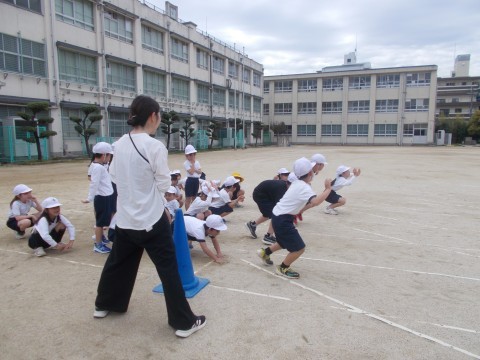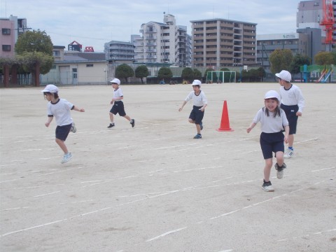 後ろ向きでスタートしたり,「うさぎさん」をしたりして,体をならしていました。おもいっきり走って,楽しそうでした。
