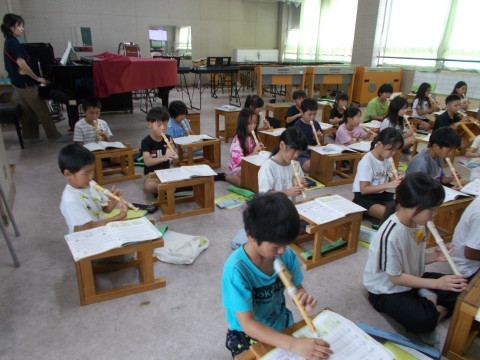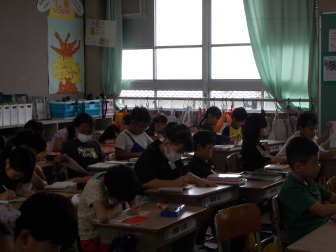 音楽では「拍子を生かしてえんそうしましょう」をめあてに、先生のピアノ伴奏で、リコーダーの練習をしていました。国語では「ちいちゃんのかげおくり」の初発の感想をワークシートに記入しました。