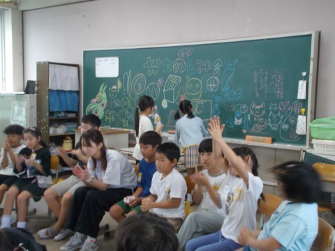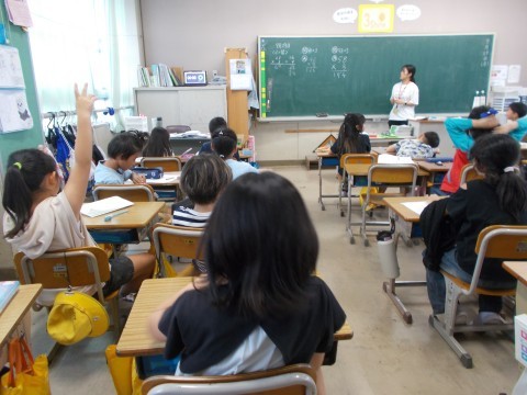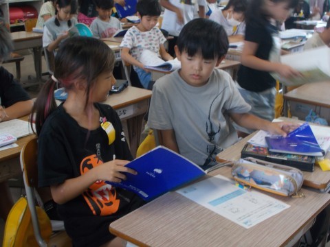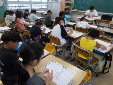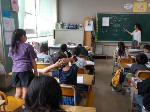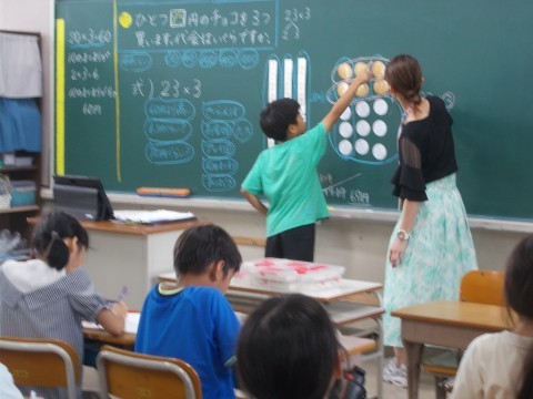 国語では、新出漢字の筆順を先生と一緒にしたり、ローマ字の練習をしたりしていました。算数では、わり算の問題に入る前に、かけ算九九の練習から始めました。