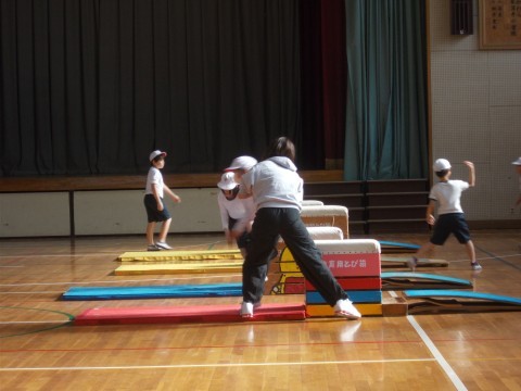 マット運動「後転」の練習です。上手な友だちの「手」の位置を見て,自分で試していました。また,友ふだちからもアドバイスをもらいました。どんどん上手になっています。
