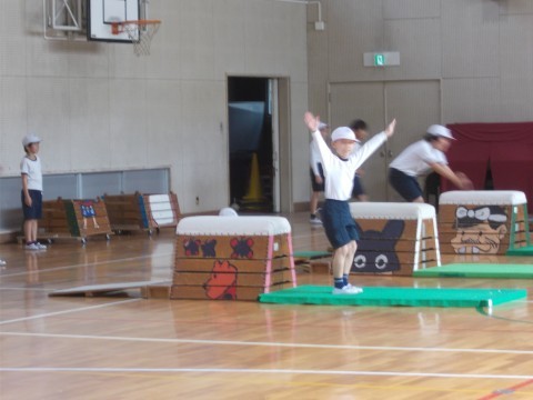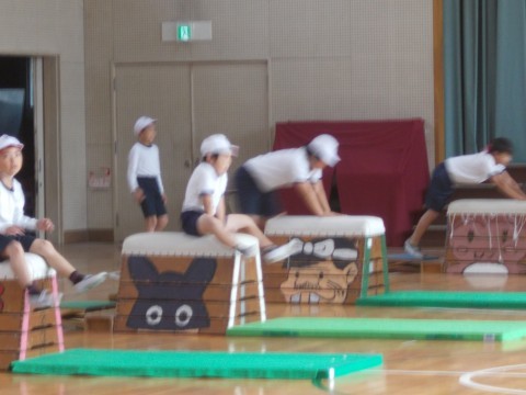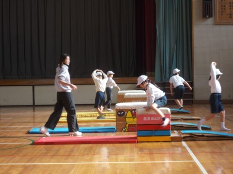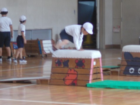 跳び箱運動をしています。手の付く位置,踏み切る勇気を意識して助走にはいります。何度も繰り返しチャレンジします!