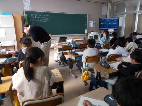 参観で,調べたことを発表します。今日は,パソコンに自分の考えをまとめ,制限時間内に言う練習をしていました。アナウンサーのようです。