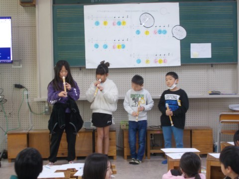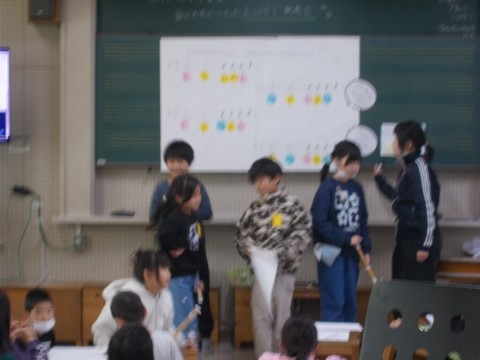 国語では「本の紹介」をします。「うらしまたろう」や「かさこじぞう」などの昔話は,「山場」のおもしろい部分があります。どうやって紹介すると読んでもらえるか,を考えながらか書いていました。音楽では,自分たちで作った「おはやし」の発表会でした。本当にお祭りが始まりそうです。理科では,実験したことをまとめていました。