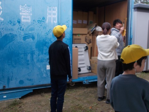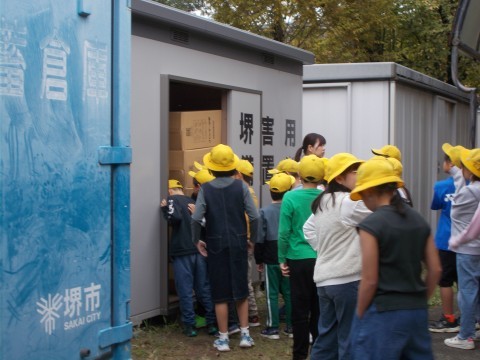災害に合った時,避難地ではどんな装備があるのか,を考えていました。本校も避難地となっています。備蓄倉庫には,水や毛布・段ボールベッドなどは入っていました。地域の皆さん用にしまってありました。