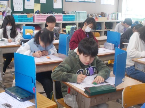 音楽では「さくらさくら」をリコーダーで練習うぃていました。日本の音階を楽しみます。理科では,水をどんどん冷やしていくと,どうなるのかをテレビの実験をみて学びました。4年生も6年生に感謝のお手紙を書いていました。