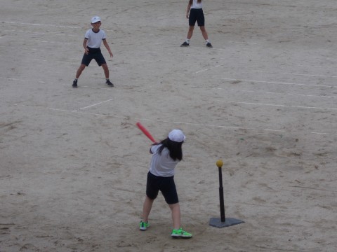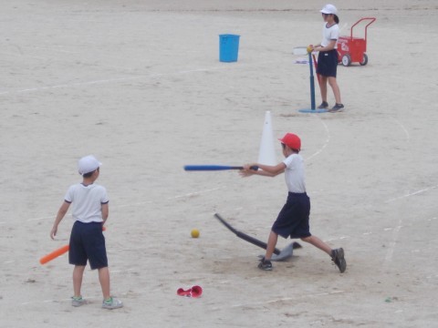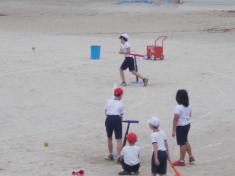 Tバッティングを練習しています。打ったら走る,が楽しくなってきました。どのベースまでいけるか,ドキドキしながら走りました!