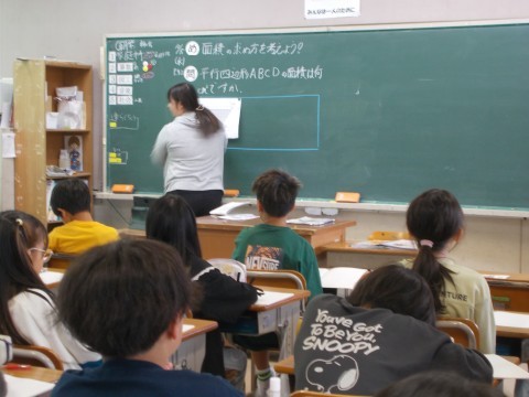 平行四辺形の面積を求めます。既習事項を使って考えていきます。見通しをもって,意欲的に取り組んでいました。解けた時,ひらめいた時の楽しさを,たくさん味わってほしいです!外国語では,自分の「hero」を英語で説明します。「何ができる」「こんな人」を文章で表現していきます。
