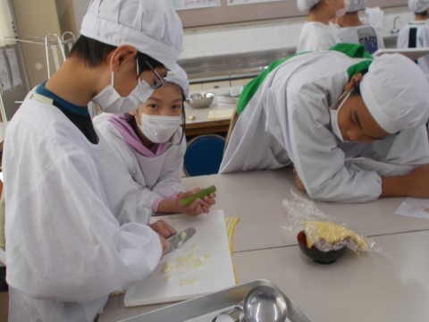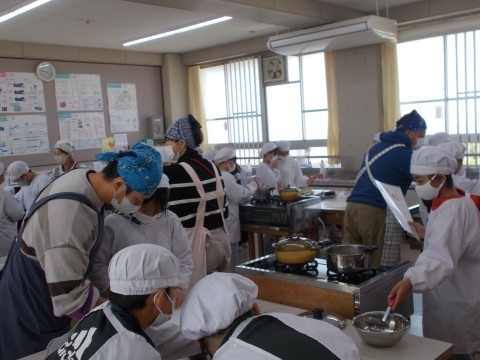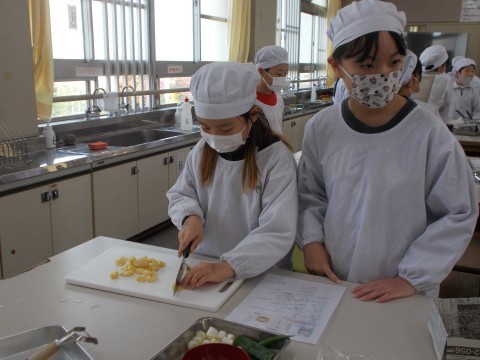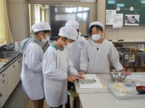ご飯と味噌汁の実習です。味噌汁の具を切ったり,ごはんが炊ける様子を観察したりしています。班で役割を決めて活動していました。にぼしのいい匂いが廊下に漂っていました。