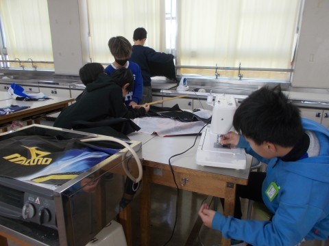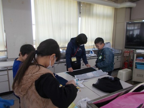 エプロン作製中です。「真っ黒でシンプル!」「かっこいいやろ」自分たちで選んだお気に入りの1枚です。