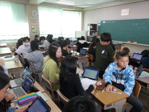外国語では,「おすすめする国」の情報を集めていました。「食べ物」や「建物」「文化」などを英語で表現します。タイピングの練習もしています。