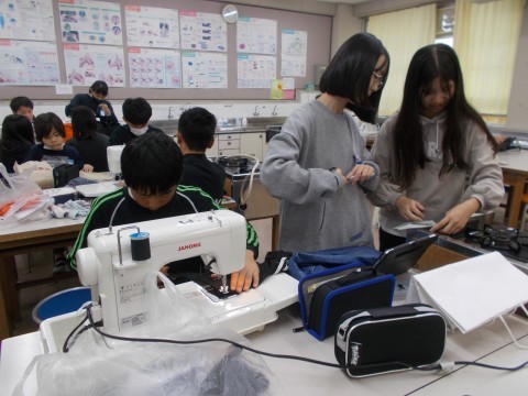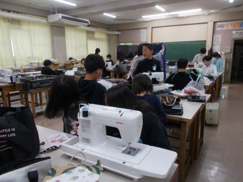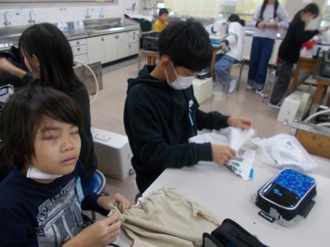 リメイク服を作ります。自分が持ってきた洋服の形をかえたり,一部分を違う布で飾ったり・・・アイデアは満載です。どんな風に変わったのか,出来上がりが楽しみです。