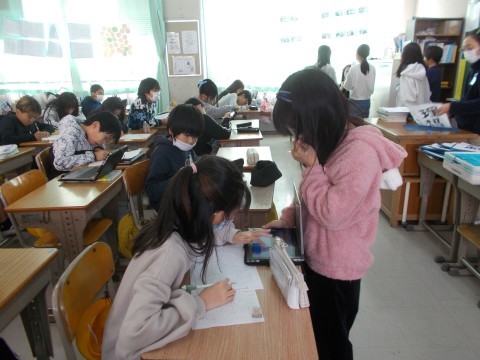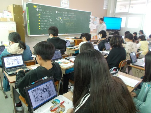 国語では「魅力が伝わる文章」の書き方を学んでいました。総合では「卒業文集」の下書きです。思い出を思い出しながら書き進めています。算数では,反比例する2つの数量の関係をグラフに表し,特徴を探しました。