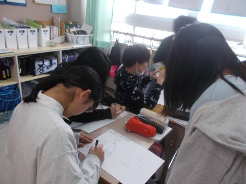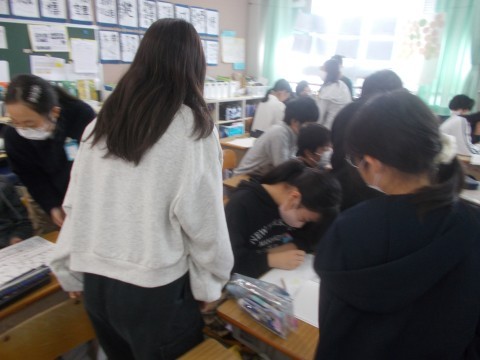 国語では,小学校最後の漢字大テストをします。いろいろな学習方法があり,パソコンで筆順通りに書いたり,漢字を何度もノートに書いたり,文章を考えて覚えるという,自分に合った練習をしていました。さすが,6年生!中学校でも使えますね!