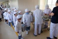 給食場の調理員さんたちが受渡場所まで持って来てくださった給食を低・高学年別に受け...
