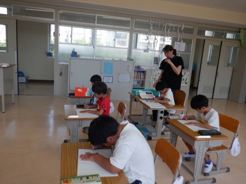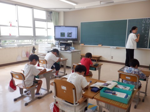 「ふうせんのようなかたちのつぼみ」について、教科書をよく見て、答えの文を探しました。黒板の文字をしっかりと写しています。