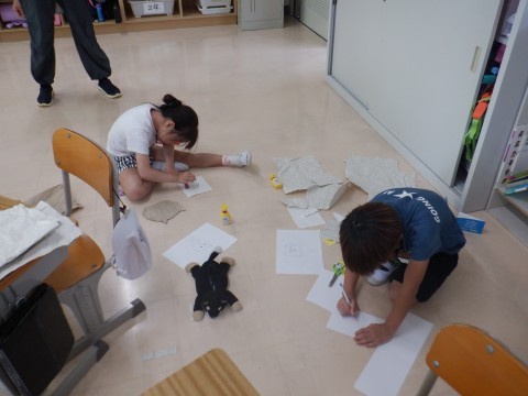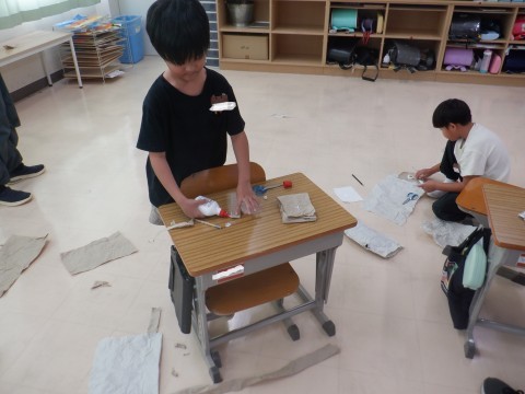 ボンドで袋状にくっつけたり,手足をつけたりしていました。集中して「お友だち」を作っていました。