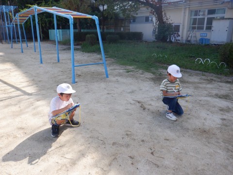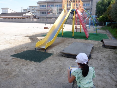 「わたしたちの学校」をテーマに描きました。お気に入りの遊具をよく見て描きました。