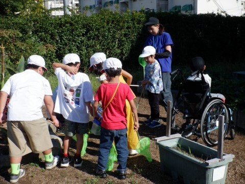 虫取りをしました。コオロギがたくさんいました。虫にもずいぶんと慣れてきています。