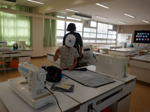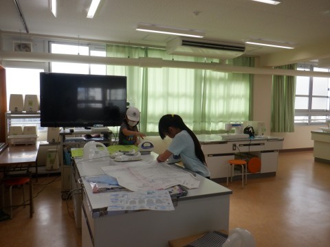 エプロン製作の続きをしました。三つ折り部分をアイロンでしっかりあてて,ミシンで縫いました。