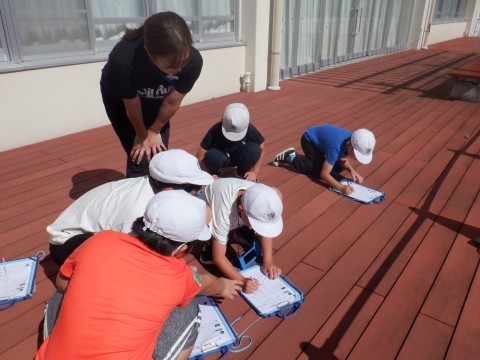 影と太陽の位置を観察しました。少しずつ太陽と影の位置が変わっていくことがわかりました。