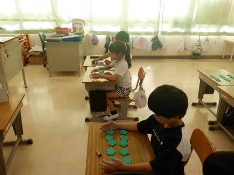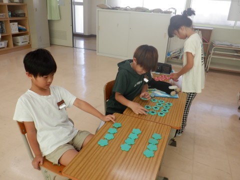 かけ算の式を見て,おはじきで,「いくつずつ,いくつぶん」を表しました。かけ算の考え方のもとになる,とても大切な学習です。