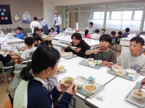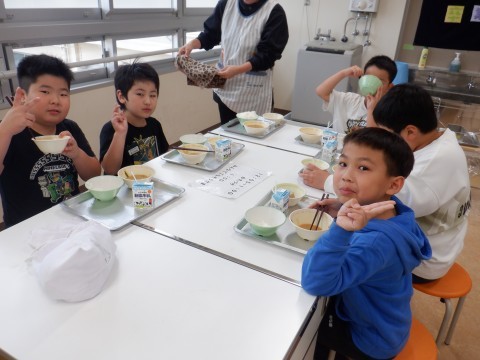 今日の給食は,ご飯,牛乳,ちゃんこ汁,豚肉の生姜炒めでした。具沢山のちゃんこ汁,おいしかったですね。
