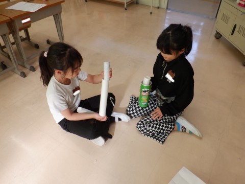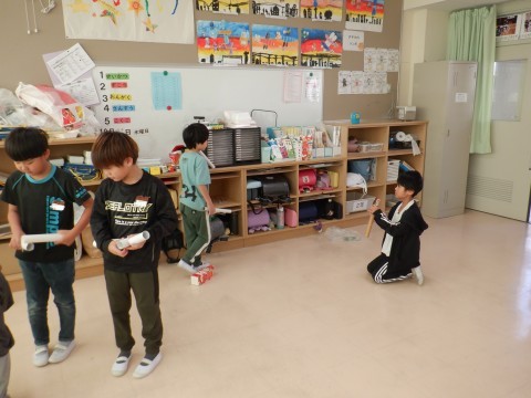 筒の形のものを使って,どんな遊びができそうなのか,考えました。中をのぞいたり,転がしたりして,試しに遊んでいました。