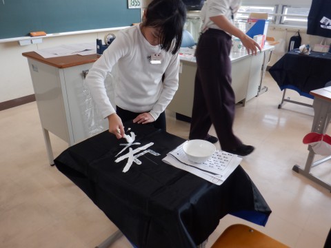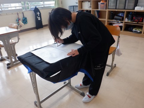 団体演技の際に着る法被に,自分が選んだ漢字一文字を書きました。緊張感をもって,書いていました。