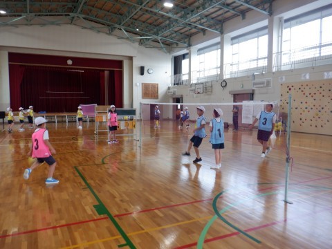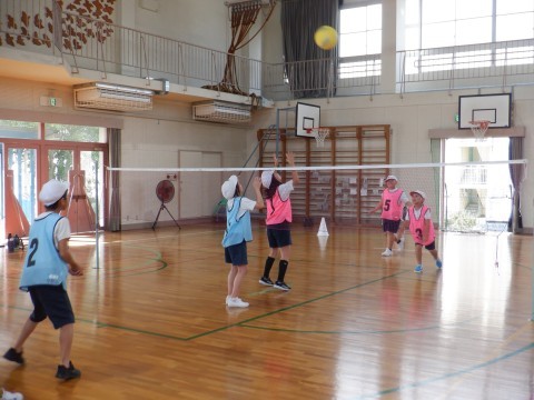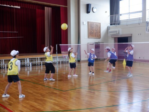 バウンドキャッチバレーをしました。「ごめん」「いいよ,いいよ」と声をかけ合いながら,ボールをつないでいました。