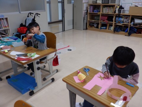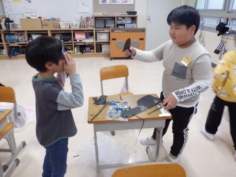 「かぶって へんしん」の活動で,こだわりの変身グッズをつくりました。