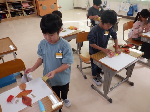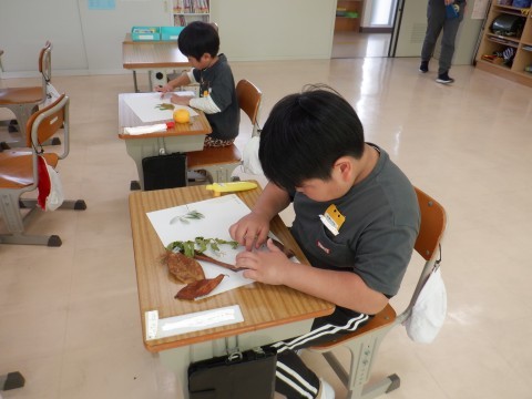 学校で見つけた葉っぱを使って,お絵かきをしました。おもしろい形やきれいな葉っぱを活かして,のりで画用紙に貼りました。