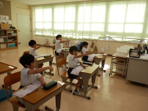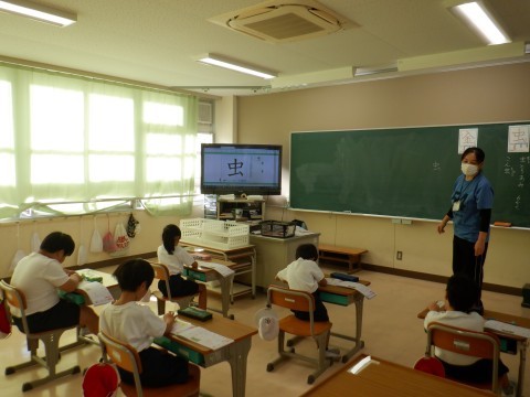 漢字の「虫」「金」を学習しました。大きく空書きして,止めるところ,払うところをみんなで確認しています。