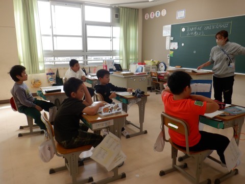 玉入れゲームで,かごからの長さが等しくなるように並ぶためには,どんな線をかけばいいのか考えました。