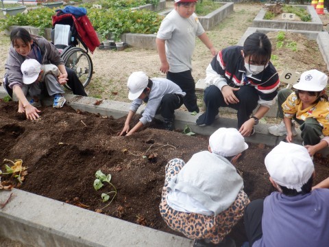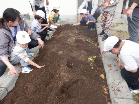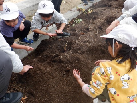 芋ほりをしました。お芋が途中でちぎれてしまわないように,周りの土をそっと掘っていきました。今まで葉っぱや土に隠れていたいろいろな虫が出てきました。