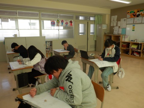 「思い出の場所」を描いています。細かい背景も画用紙いっぱいに描いています。もうすぐ下書きも完成です。