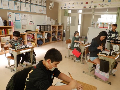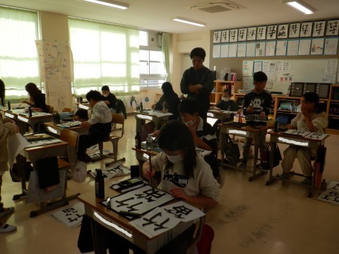 毛筆で「竹笛」と書きました。お手本をよく見て,はらいゃはねに気をつけて書いていました。